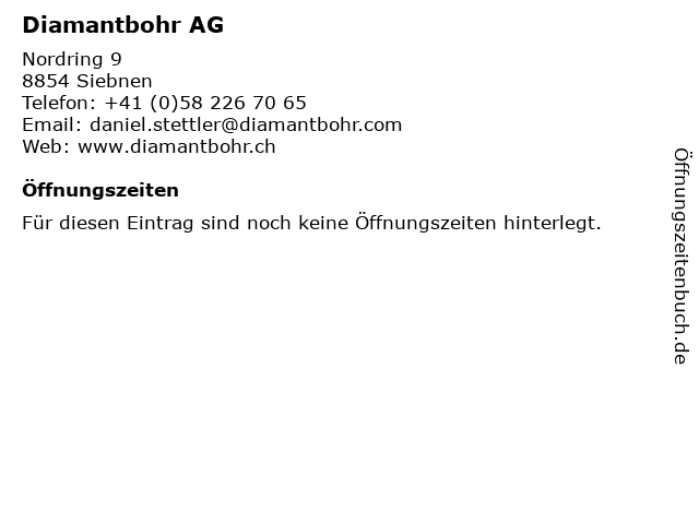 | Öffnungszeiten Diamantbohr AG in Siebnen anzeigen | |