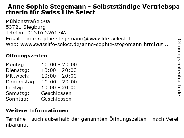 Branchen & Suchbegriffe zu Anne Sophie Stegemann - Selbstständige Vertriebspartnerin für Swiss Life Select:anne, berufshaftpflichtversicherung, berufsunfähigkeitsversicherung, finanzplanung, gebäude- und hausratsversicherung, investmentservice, lebensversicherung, life, mietrechtsschutzversicherung, pflegeversicherung, selbstständige, select, sophie, stegemann, swiss, versicherungsberater, vertriebspartnerin |