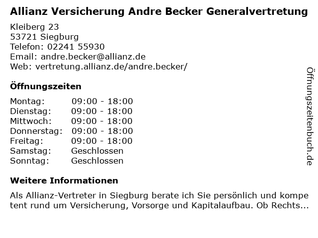 1 3 Allianz Versicherung Kai Kolepka Generalvertretung (Entfernung: 0,18 km) Wolsdorfer Straße 34-36, 53721 Siegburg 6 |