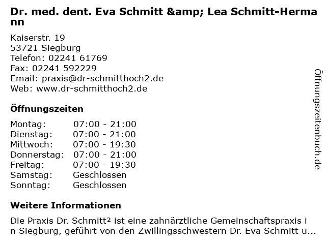 Branchen & Suchbegriffe zu Dr. med. dent. Eva Schmitt & Lea Schmitt-Hermann:dent., dr., eva, hermann, lea, med., schmitt |