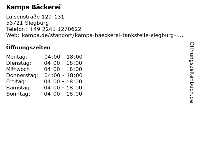 | Öffnungszeiten Kamps Bäckerei in Siegburg anzeigen | |