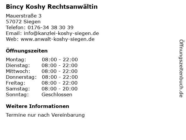 | Öffnungszeiten Bincy Koshy Rechtsanwältin in Siegen anzeigen | |