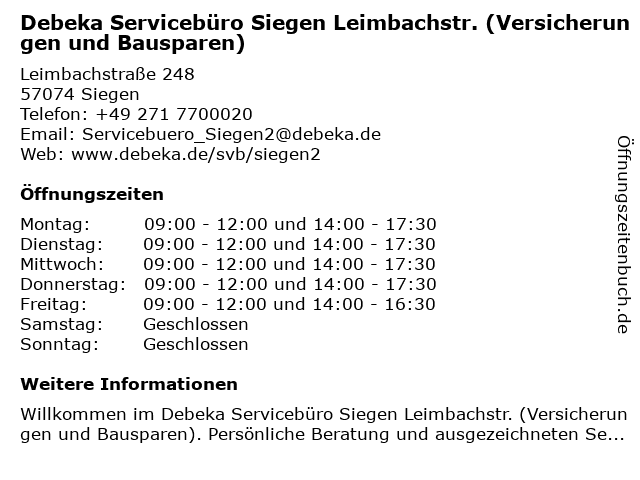 2 Debeka Geschäftsstelle Siegen (Versicherungen und Bausparen) (Entfernung: 2,26 km) Donzenbachstraße 41, 57072 Siegen 4 Debeka Servicebüro Siegen (Versicherungen und Bausparen) (Entfernung: 7,12 km) Bahnstraße 19, 57078 Siegen 5 Birgitt Neumann Servicebüro für Musiker u. Musikverlage (Entfernung: 7,46 km) Im Wiesental 64, 57078 Siegen 6 Stock, Christoph - Debeka Versicherung und Bausparkasse (Entfernung: 10,57 km) Berghofstr. 6, 57078 Siegen |
