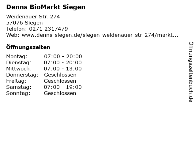 | Öffnungszeiten Denns BioMarkt Siegen in Siegen anzeigen | |