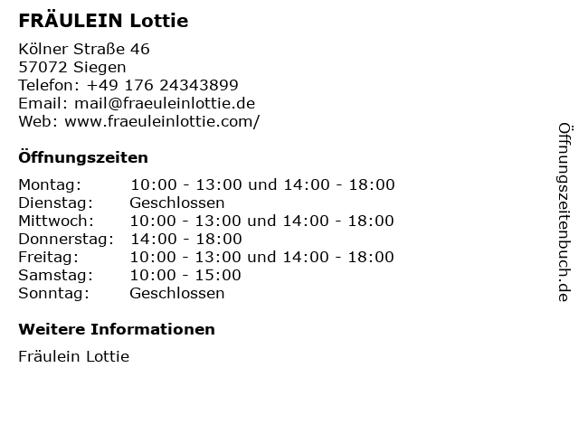 | Öffnungszeiten FRÄULEIN Lottie in Siegen anzeigen | |