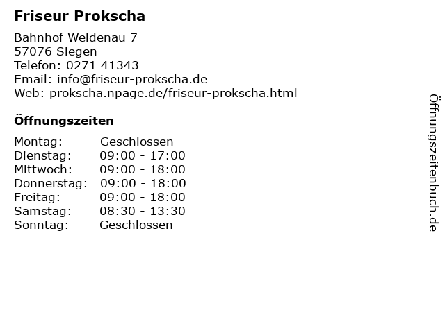 | Öffnungszeiten Friseur Prokscha in Siegen anzeigen | |
