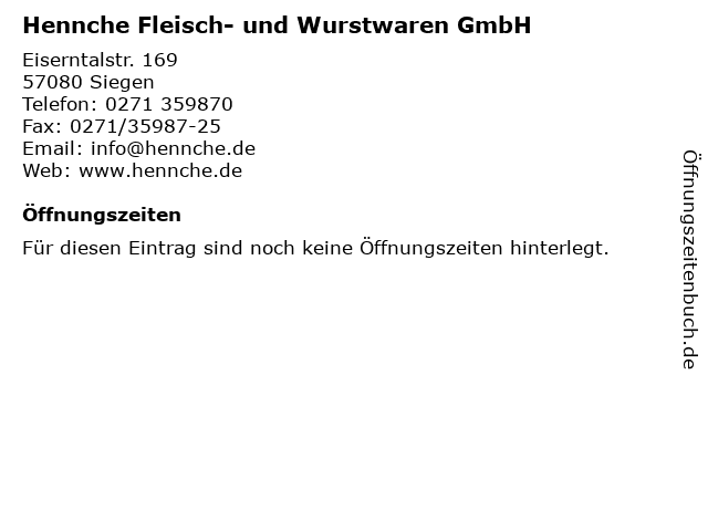 1 Hennche Fleisch- und Wurstwaren GmbH (Entfernung: 0,97 km) Eiserntalstraße 71, 57080 Siegen-Eiserfeld 6 |