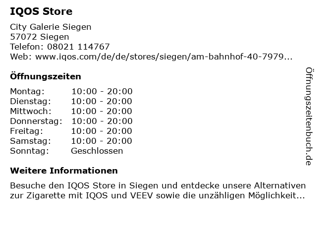 | Öffnungszeiten IQOS Store in Siegen anzeigen | |