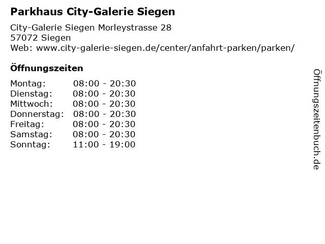 | Öffnungszeiten Parkhaus City-Galerie Siegen in Siegen anzeigen | |