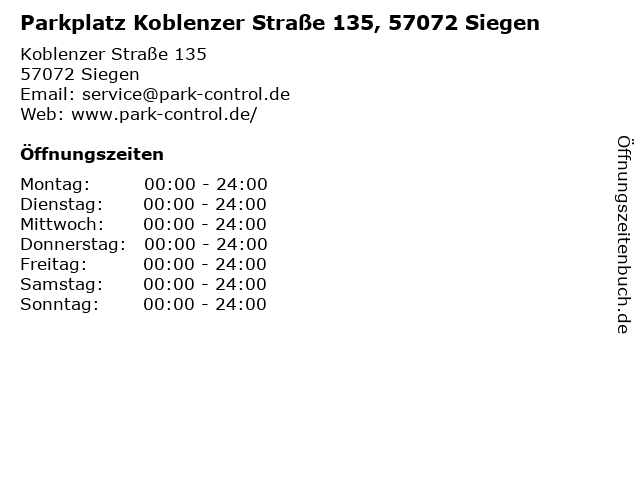 | Öffnungszeiten Parkplatz Koblenzer Straße 135, 57072 Siegen in Siegen anzeigen | |