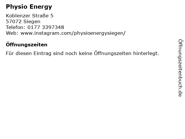 | Öffnungszeiten Physio Energy in Siegen anzeigen | |