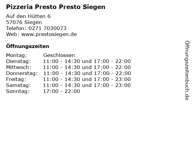 | Öffnungszeiten Pizzeria Presto Presto Siegen in Siegen anzeigen | |