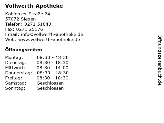 | Öffnungszeiten Vollwerth-Apotheke in Siegen anzeigen | |