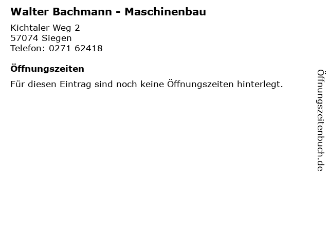 | Öffnungszeiten Walter Bachmann - Maschinenbau in Siegen anzeigen | |