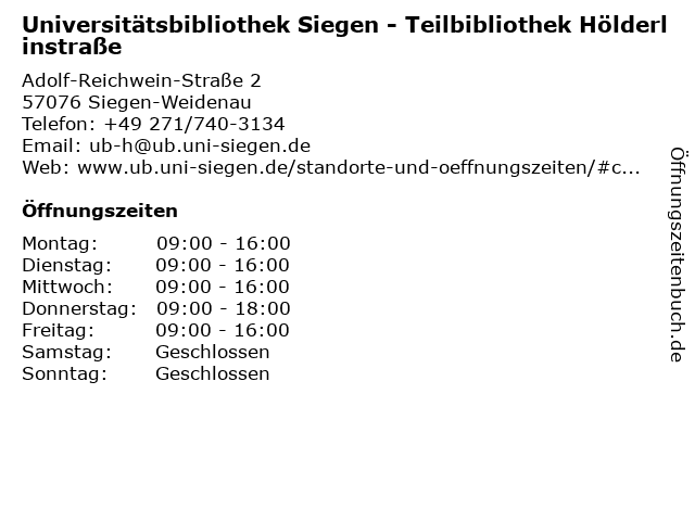 Branchen & Suchbegriffe zu Universitätsbibliothek Siegen - Teilbibliothek Hölderlinstraße:bibliothek, buch, buchscanner, hölderlinstraße, literaturen, siegen, sprachen, teilbibliothek, universitätsbibliothek |
