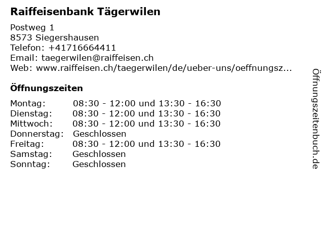 3 Raiffeisenbank Tägerwilen (Bancomat - Geldautomat) (Entfernung: 0,00 km) Postweg 1, 8573 Siegershausen 5 Raiffeisenbank Tägerwilen (Bancomat - Geldautomat) (Entfernung: 4,32 km) Hauptstrasse 53, 8280 Kreuzlingen 6 |