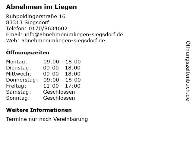 | Öffnungszeiten Abnehmen im Liegen in Siegsdorf anzeigen | |