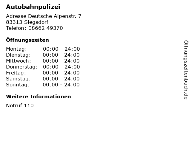 | Öffnungszeiten Autobahnpolizei in Siegsdorf anzeigen | |