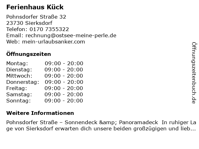 | Öffnungszeiten Ferienhaus Kück in Sierksdorf anzeigen | |