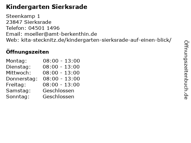 | Öffnungszeiten Kindergarten Sierksrade in Sierksrade anzeigen | |
