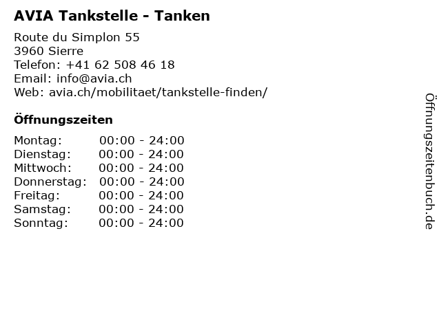 | Öffnungszeiten AVIA Tankstelle - Tanken in Sierre anzeigen | |
