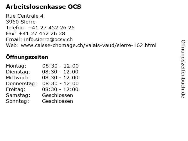 | Öffnungszeiten Arbeitslosenkasse OCS in Sierre anzeigen | |
