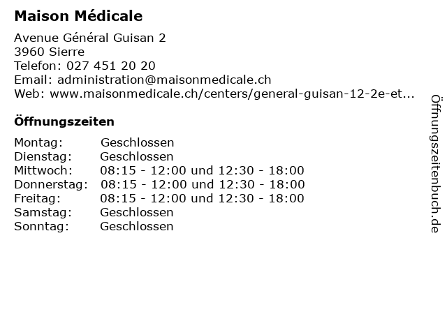 | Öffnungszeiten Maison Médicale in Sierre anzeigen | |