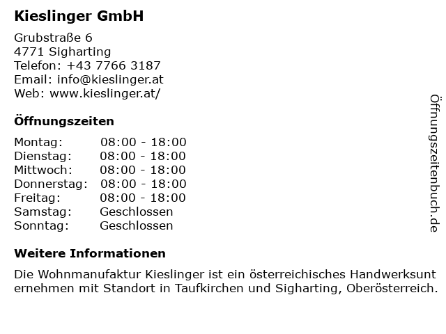 | Öffnungszeiten Kieslinger GmbH in Sigharting anzeigen | |
