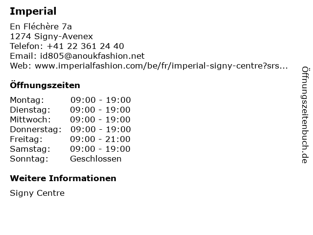 | Öffnungszeiten Imperial in Signy-Avenex anzeigen | |
