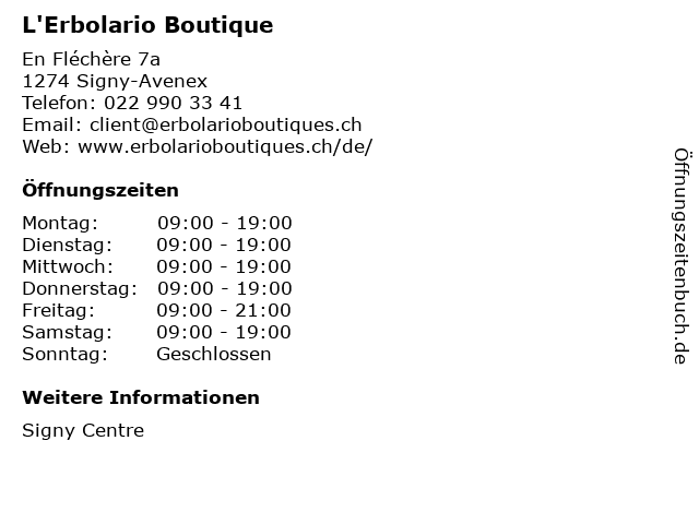 | Öffnungszeiten L'Erbolario Boutique in Signy-Avenex anzeigen | |