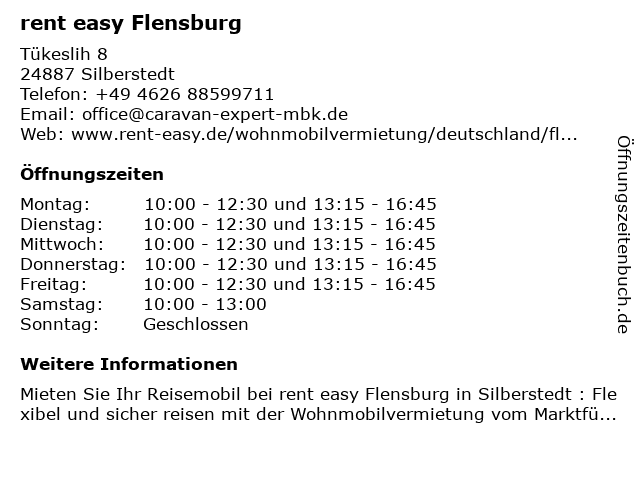 | Öffnungszeiten rent easy Flensburg in Silberstedt anzeigen | |