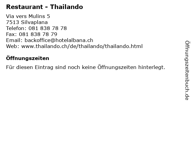 | Telefonnummer Restaurant - Thailando in Silvaplana (081 838 78 78) anrufen | |