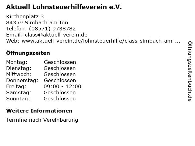 2 Altbayerischer Lohnsteuerhilfeverein e.V. - Kirchdorf am Inn Atzing (Entfernung: 1,86 km) Atzinger Allee 43, 84375 Kirchdorf am Inn 3 Lohnsteuerhilfeverein HILO e.V. - Beratungsstellenleiterin Bettina Ehgartner (Entfernung: 10,27 km) Ed bei Münchham 4a, 94140 Ering 4 Lohnsteuerberatungsverbund e. V. -Lohnsteuerhilfeverein- Beratungsstelle Tann (Entfernung: 12,16 km) Kronwittener Straße 17, 84367 Tann 5 6 Lohnsteuerberatungsverbund e.V. - Lohnsteuerhilfeverein - Beratungsstellenleiter Rechtsanwalt Rudolf Evert (Entfernung: 14,01 km) Hanns-Dobler-Straße 1, 84371 Triftern |