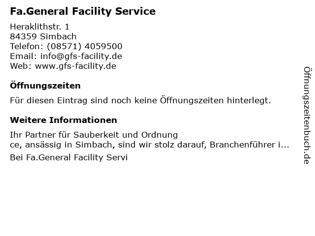 | Öffnungszeiten Fa.General Facility Service in Simbach anzeigen | |