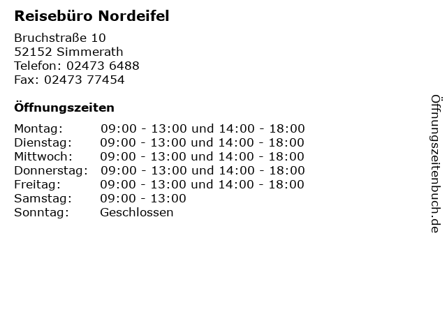 | Öffnungszeiten Reisebüro Nordeifel in Simmerath anzeigen | |