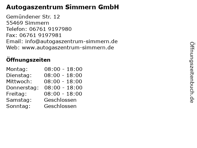 | Öffnungszeiten Autogaszentrum Simmern GmbH in Simmern anzeigen | |