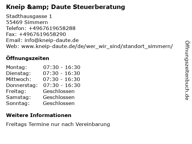 | Öffnungszeiten Kneip & Daute Steuerberatung in Simmern anzeigen | |