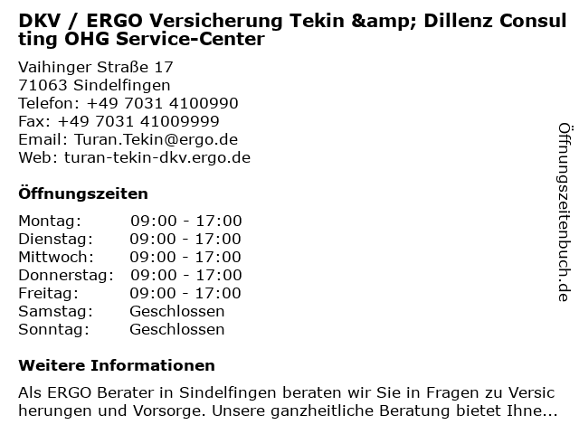 1 DKV / ERGO Versicherung Tekin & Dillenz Consulting OHG Service-Center (Entfernung: 0,00 km) Rotebühlplatz 23, 70178 Stuttgart 2 DKV / ERGO Versicherung Tekin & Dillenz Consulting OHG Service-Center (Entfernung: 0,00 km) Vaihinger Straße 17, 71063 Sindelfingen 3 DKV / ERGO Versicherung Tekin & Dillenz Consulting OHG Service-Center (Entfernung: 0,00 km) Vaihinger Straße 17, 71063 Sindelfingen 4 DKV / ERGO Versicherung Dominik Kokschka (Entfernung: 0,01 km) Vaihinger Straße 17, 71063 Sindelfingen 6 DKV Deutsche Krankenversicherung Florian Dillenz (Entfernung: 7,99 km) Hauptstraße 16, 70563 Stuttgart |