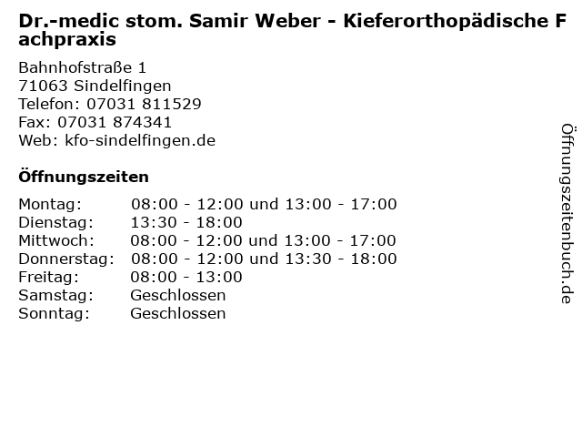 2 Kieferorthopädische Gemeinschaftspraxis -Dr. Britta Barmé I Hans Peter Herrmann (Entfernung: 0,17 km) Rathausplatz 5, 71063 Sindelfingen 3 Dr.-medic/IM Temeschburg Violetta König FA für Allgemeinmedizin (Entfernung: 0,26 km) Seemühlestr. 27, 71063 Sindelfingen 5 Dr. medic. stom. Elena Pasternak Zahnärztin (Entfernung: 2,49 km) Stadtgrabenstr. 20, 71032 Böblingen 6 Dr. medic. (IMF Temeschburg) Diana Szepesi FÄ für Augenheilkunde (Sprechzeiten) (Entfernung: 8,93 km) Möhringer Landstr. 54, 70563 Stuttgart |