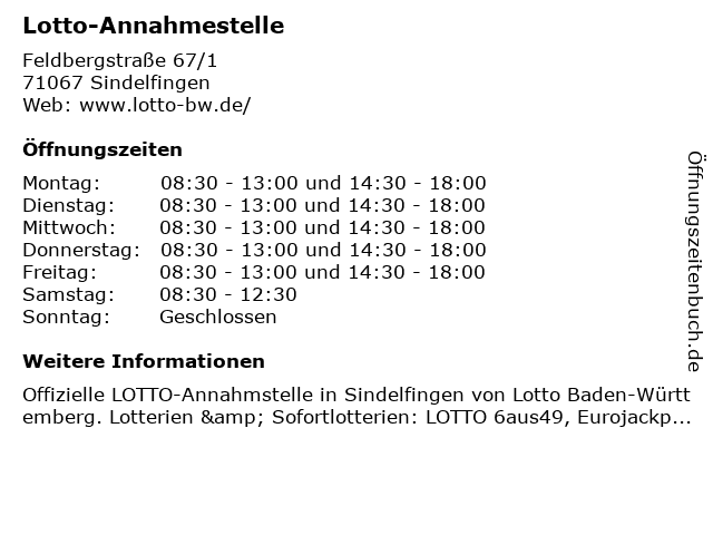 | Öffnungszeiten Lotto-Annahmestelle in Sindelfingen anzeigen | |