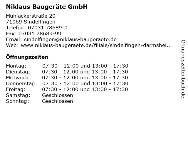 | Öffnungszeiten Niklaus Baugeräte GmbH in Sindelfingen anzeigen | |