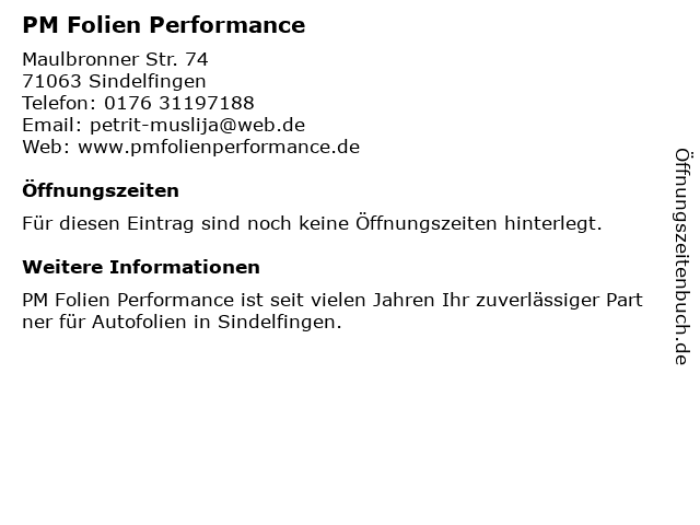 | Öffnungszeiten PM Folien Performance in Sindelfingen anzeigen | |