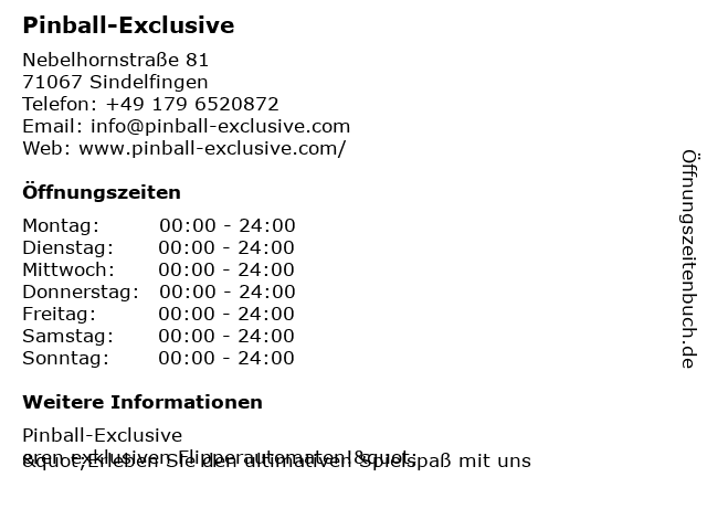 | Öffnungszeiten Pinball-Exclusive in Sindelfingen anzeigen | |