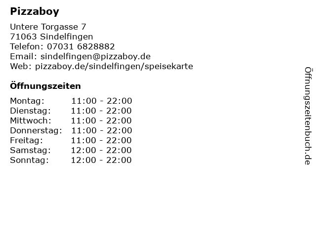 | Öffnungszeiten Pizzaboy in Sindelfingen anzeigen | |