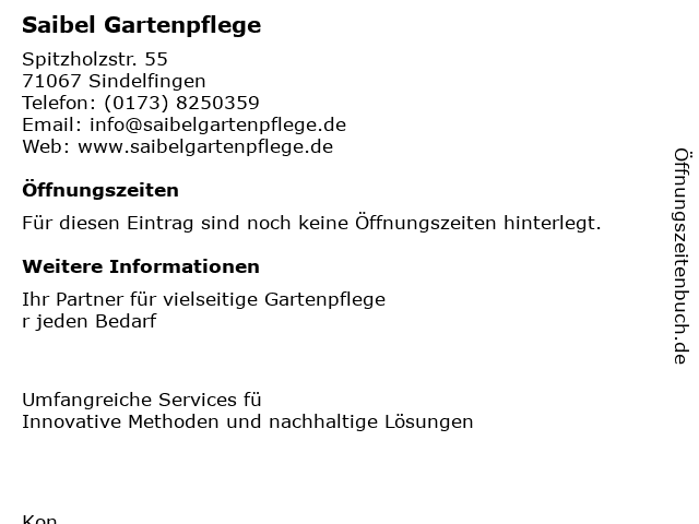 | Öffnungszeiten Saibel Gartenpflege in Sindelfingen anzeigen | |