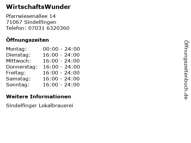 | Öffnungszeiten WirtschaftsWunder in Sindelfingen anzeigen | |