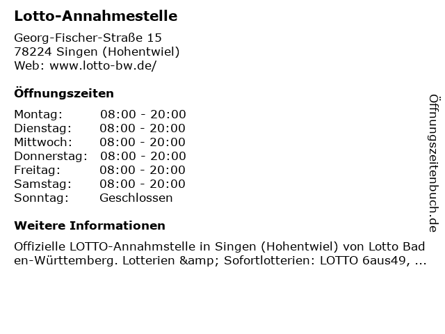 | Öffnungszeiten Lotto-Annahmestelle in Singen (Hohentwiel) anzeigen | |