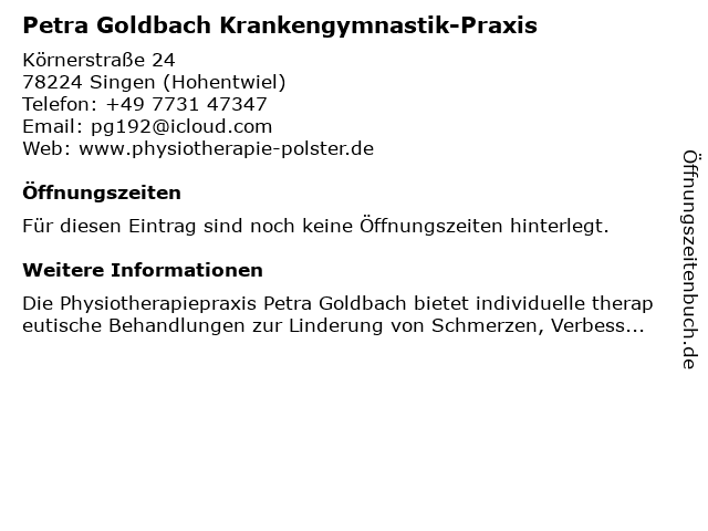 | Petra Goldbach Krankengymnastik-Praxis anrufen | |