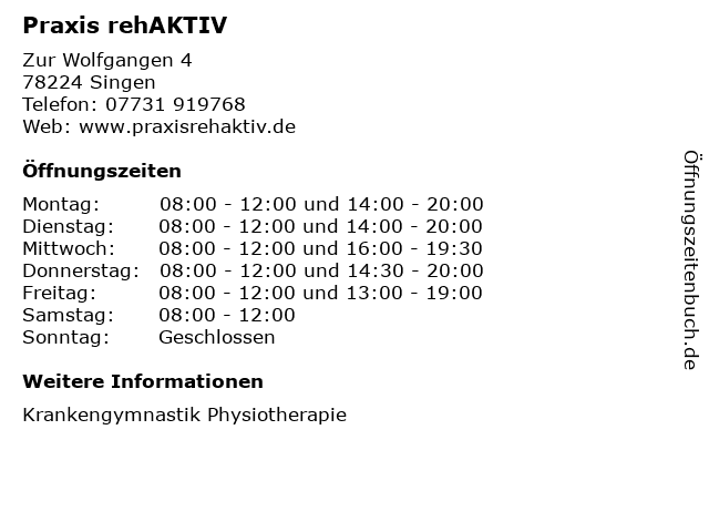 | Öffnungszeiten Praxis rehAKTIV in Singen anzeigen | |