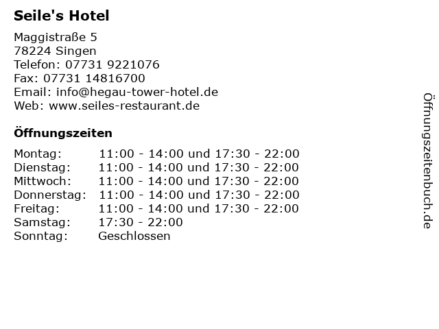 | Öffnungszeiten Seile's Hotel in Singen anzeigen | |